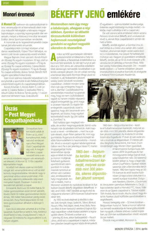 ... Első hallásra igen meglepő névadás, de amikor megmagyarázták, bántó volta helyett már dicséretként érthettük. Azért kapta ezt a nevet . emlékeztek -, mert ha a pályán elesett, olyan fitten pattant fel, mint egy gumilabda. Ruganyos és előnyös külsejét később fotómodellként is hasznosította - mondták. Mivel e nevezett egykori labdarúgónak Gábor nevű fia is (aki jelenleg a Vasas FC marketing igazgatója) tiszteletrméltóan ápolja apja emlékét és kutatja monori múltjának fellelhető gyökereit, sporttörténeti szempontból mi is érdekesnek tartottuk az ehhez való csatlakozást, emlékezetének helyi megőrzését. Annál is inkább, mert Monoron született és nyolcéves korában itt futballozni kezdő Békeffy (régebben Békeffinek írták) Jenő (1935-1987) később az egyik első és világszerte elismert UEFA-licenszes futballmenedzser lett. ....